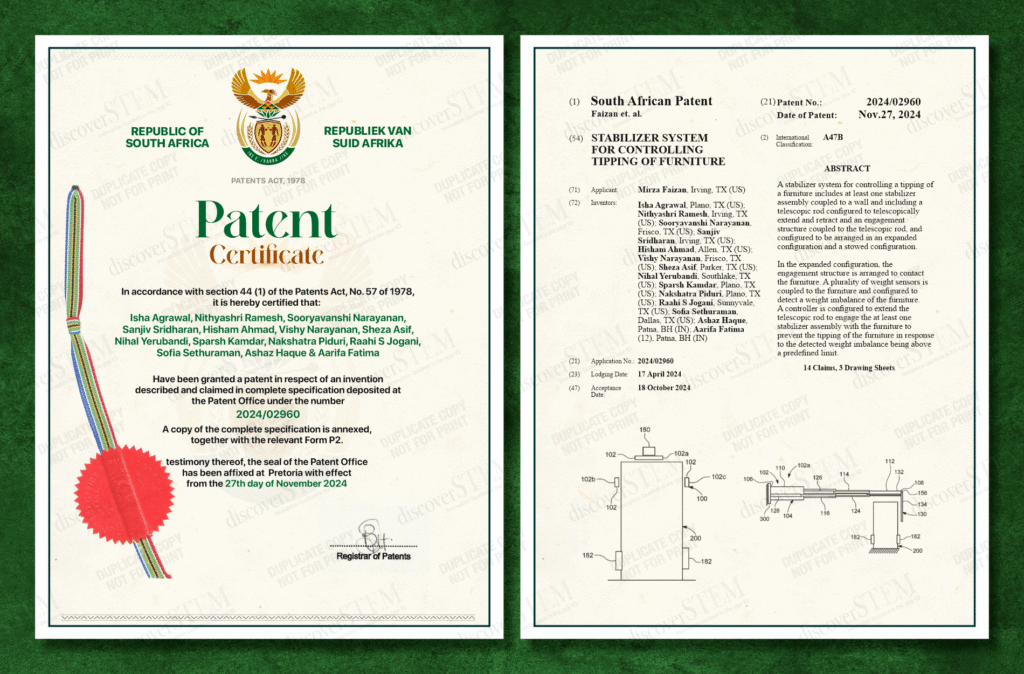 This team of young inventors at DiscoverSTEM innovated a smart furniture stabilizer using a telescopic rod assembly connected to both walls and furniture.